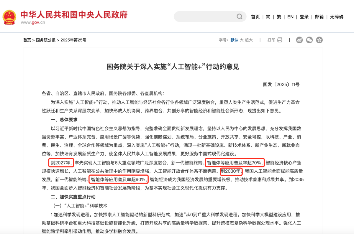 國務(wù)院《“人工智能+”行動(dòng)指導意見(jiàn)》明確提出,要推動(dòng)智能體技術(shù)在民生服務(wù)、文化旅游等領(lǐng)域的深度融合與應用創(chuàng )新,到2027年,智能體應用普及率超70%。到2030年,智能體應用普及率超90%。作為“人工智能+”落地的重要形態(tài),智能體正成為賦能千行百業(yè)、重塑服務(wù)體驗的關(guān)鍵力量。
