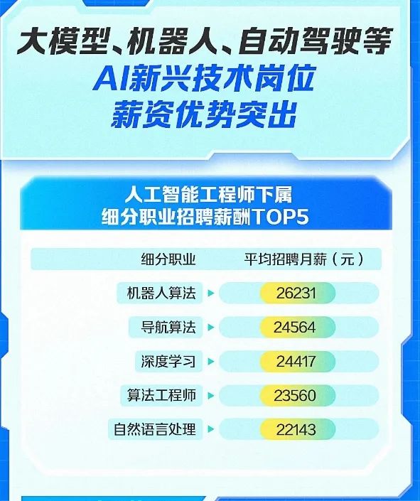 機器人、大模型、自動(dòng)駕駛等新興領(lǐng)域的技術(shù)崗位薪資更高。機器人算法工程師的平均招聘月薪最高,達到26231元,緊隨其后的是導航算法和深度學(xué)習工程師,分別為24564元和24417元。