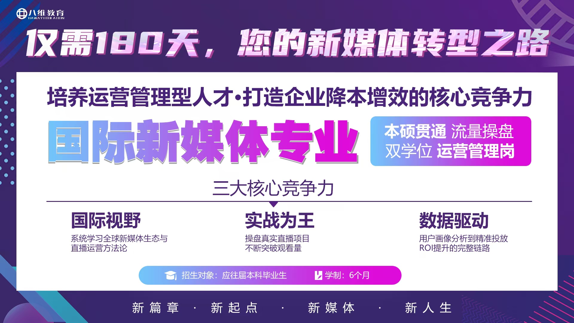 在直播經(jīng)濟蓬勃發(fā)展的今天,八維教育國際新媒體專(zhuān)業(yè)的六個(gè)月直播運營(yíng)管理實(shí)戰班,正以其獨特的教學(xué)模式、強大的師資力量和豐富的實(shí)踐機會(huì ),全力打造學(xué)生的直播運營(yíng)管理核心能力。為廣大學(xué)子開(kāi)啟一扇通往直播經(jīng)濟新藍海的大門(mén),讓他們在這個(gè)充滿(mǎn)機遇與挑戰的時(shí)代,憑借自身的專(zhuān)業(yè)能力和綜合素質(zhì),實(shí)現人生的價(jià)值與夢(mèng)想。相信在八維教育的精心培育下,一批又一批優(yōu)秀的直播運營(yíng)管理人才將脫穎而出,為直播經(jīng)濟的持續發(fā)展注入源源不斷的動(dòng)力。