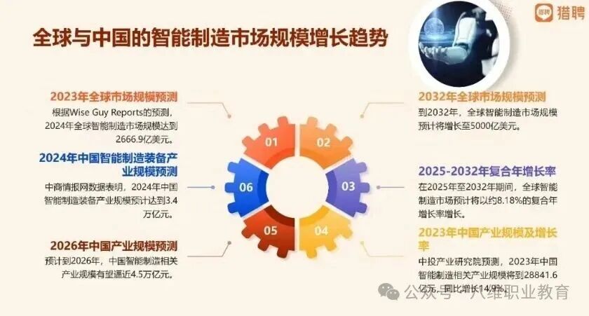 獵聘《2025年智能制造領(lǐng)域人才供需洞察報告》信息顯示,中國智能制造業(yè)在政策支持、市場(chǎng)體量、技術(shù)發(fā)展等多方面因素影響下,有望在2030年前躋身行業(yè)第一梯隊。預測2025年行業(yè)規模將突破5萬(wàn)億元,未來(lái)十年復合增長(cháng)率保持12%-15%。