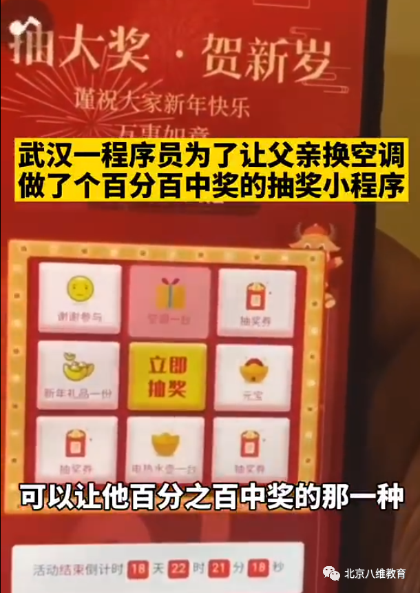 武漢程序員小李,一直想為父親換一臺空調,但是老父親節約一輩子慣了,始終不允許孩子多花錢(qián)。沒(méi)辦法,小李只好發(fā)揮自己的專(zhuān)業(yè)才能“套路”父親——他用代碼為父親開(kāi)發(fā)了一個(gè)抽獎小程序,并且告訴父親可以參與抽獎。父親當然不知道這個(gè)為他量身定做的程序,是百分百中獎的。在父親為中了空調頭獎高興時(shí),小李的孝心也悄無(wú)聲息的盡到了。