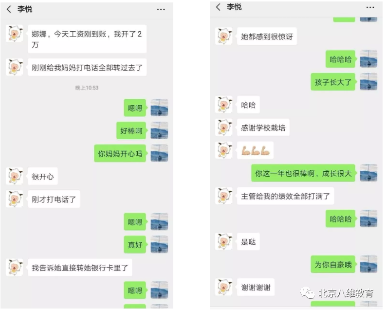通過(guò)樹(shù)立學(xué)生信仰、錘煉自身能力的感恩教育,八維教育是讓學(xué)生思考著(zhù)“一個(gè)人怎樣活著(zhù)比活著(zhù)更重要”這一人生命題。于是,八維學(xué)校的學(xué)生總能盡己所能地回饋父母。像武漢程序員小李那樣,八維的學(xué)生畢業(yè)后,總會(huì )拿出自己月薪的一大部分,"上繳”給父母,這既是對父母養育之恩的報答,也是向父母證明著(zhù)自己的成長(cháng)與能力、讓他們放心安心。