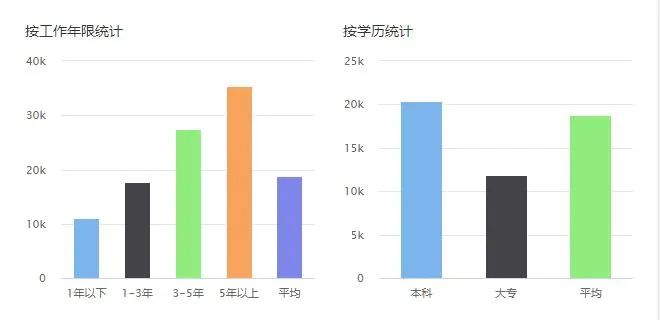 從學(xué)歷和工作年限的維度來(lái)看,工作3~5年的月薪都在20K以上,工作5年以上的,月薪均在30K以上,而在學(xué)歷要求方面,大專(zhuān)學(xué)歷比比皆是。
