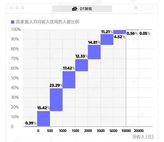 北京師范大學(xué)中國收入分配研究院發(fā)布的一篇調查數據顯示:我國人均可支配月收入(扣除個(gè)人所得稅等之外可用于實(shí)際使用的可支配收入)在10000元以上的家庭占比僅為0.61%。換言之,家庭人均可支配收入過(guò)萬(wàn)意味著(zhù)超過(guò)了全國99%的家庭。