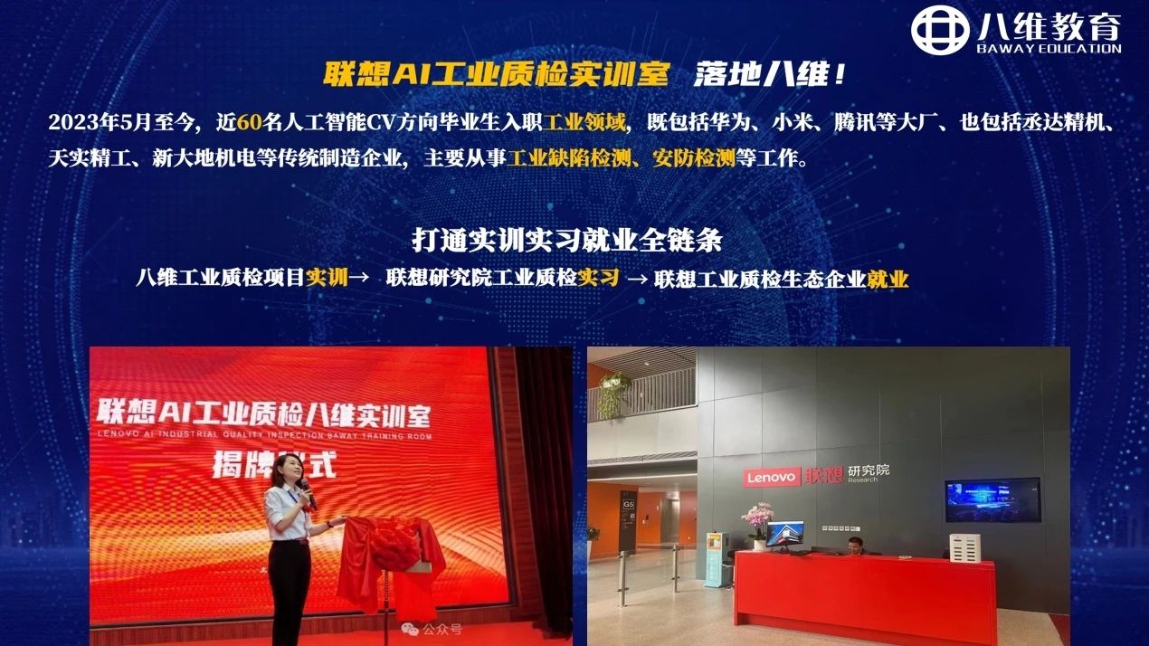另外,八維文化與產(chǎn)業(yè)研究院通過(guò)引入聯(lián)想AI工業(yè)質(zhì)檢實(shí)訓室落地八維,打通了學(xué)生實(shí)訓、實(shí)習、就業(yè)全鏈條,全方位幫助學(xué)子實(shí)現優(yōu)質(zhì)就業(yè)!2023年5月至今,近60名人工智能CV方向畢業(yè)生入職工業(yè)領(lǐng)域,既包括華為、小米、騰訊等頭部大廠(chǎng),也包括丞達精機、天實(shí)精工、新大地機電等傳統制造企業(yè),主要從事工業(yè)缺陷檢測、安防檢測等工作。