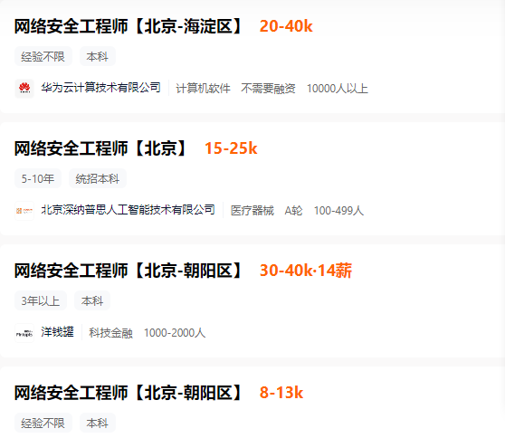 據某招聘平臺數據顯示,應屆畢業(yè)生平均起薪都在萬(wàn)元以上,尤其是一線(xiàn)、新一線(xiàn)城市,具備扎實(shí)技術(shù)的本科生起薪普遍在12000-18000元/月,擁有3-5年工作經(jīng)驗的高級安全工程師或者專(zhuān)家,年薪30-70萬(wàn)已成常態(tài),頂尖人才薪資則更高。