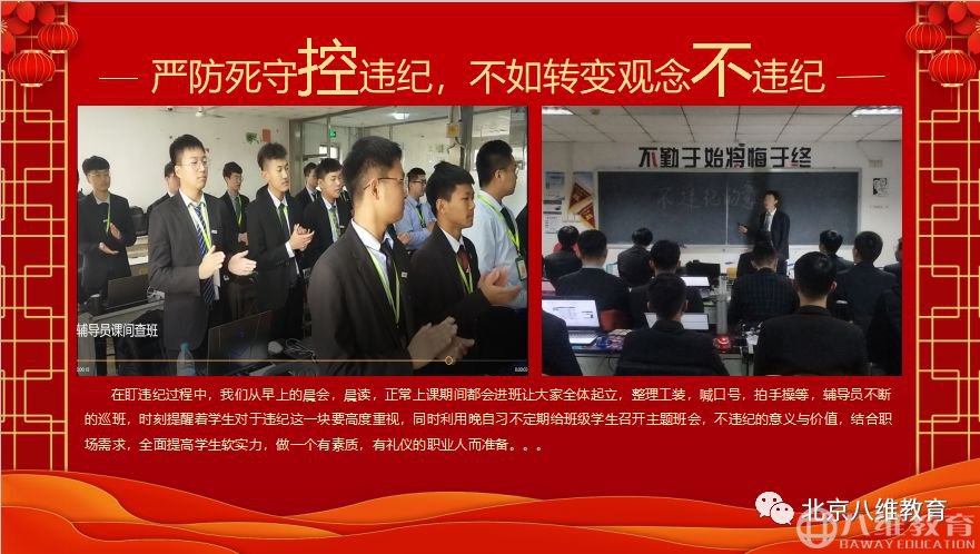 人工智能專(zhuān)業(yè)通過(guò)實(shí)戰項目的演練,強化技術(shù)能力來(lái)打造學(xué)生的“硬實(shí)力”,同時(shí)通過(guò)特色的學(xué)生自主管理體系,培養學(xué)生的管理能力和組織能力,培養學(xué)生“軟實(shí)力”。通過(guò)晨會(huì )、日講評、團建等等方式,讓學(xué)生做一個(gè)有素質(zhì)、有禮儀的職場(chǎng)人。