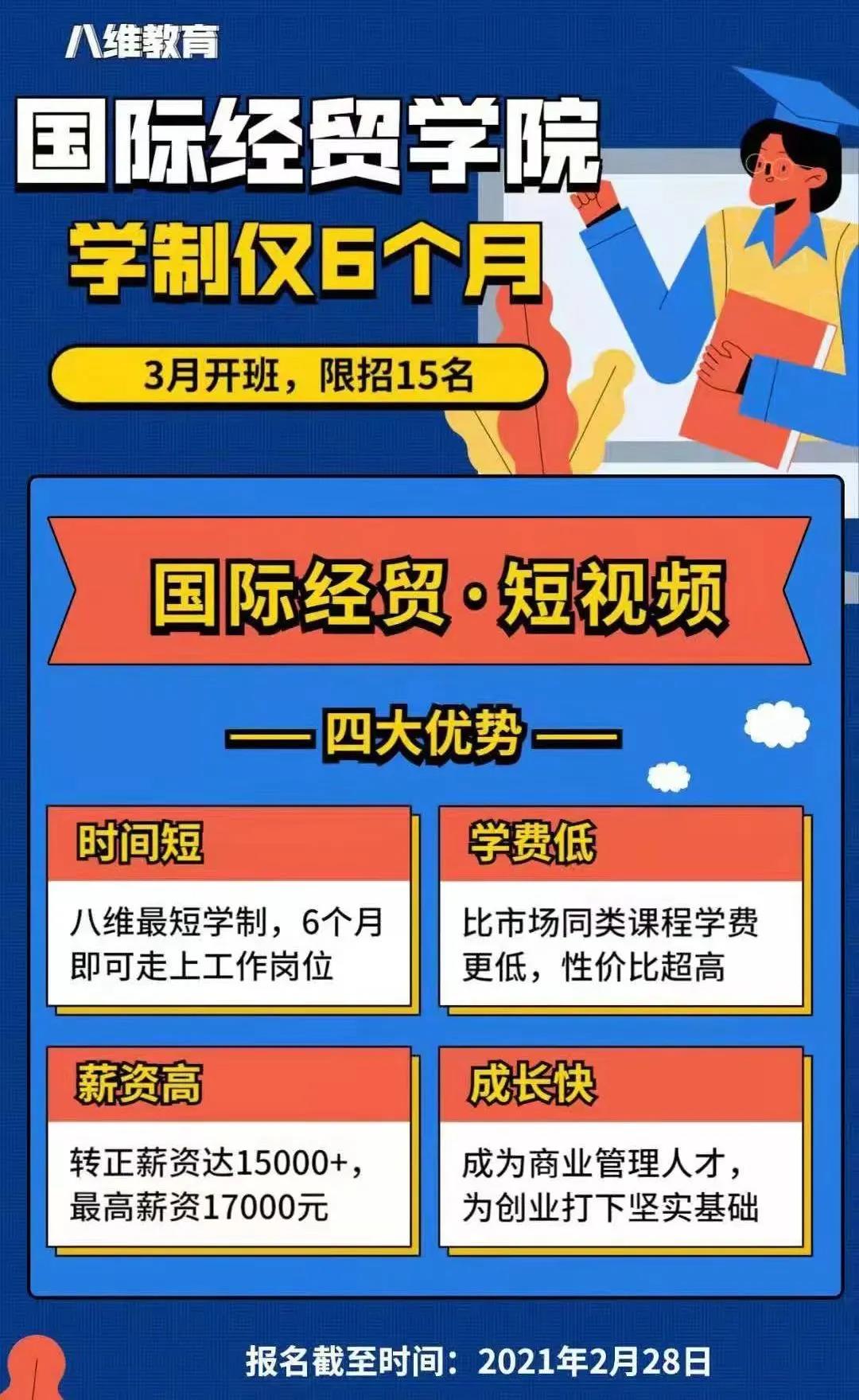 尤其是短視頻課程方向用時(shí)短、花費少、入門(mén)快、薪資高。要知道,在全國農村經(jīng)濟發(fā)展接入電子商務(wù),在全國各地都“帶貨成風(fēng)”下,學(xué)習國際經(jīng)貿,就有了全國多地就業(yè)的機會(huì ),有著(zhù)960萬(wàn)平方公里的施展天地。