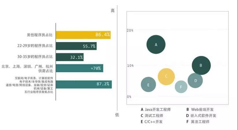 縱觀(guān)行業(yè)分布,互聯(lián)網(wǎng)/電子商務(wù)、計算機軟件聚集了超過(guò)六成的程序員群體,是最需要程序員崗位的。北京、上海、深圳、廣州、杭州作為互聯(lián)網(wǎng)產(chǎn)業(yè)發(fā)達的代表城市,占據了全國七成的人才需求。