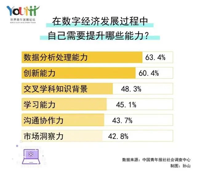 調查了解到,多數年輕人認為自身諸多方面能力尚有不足,仍急需提升。其中,數據分析處理能力(63.4%)、創(chuàng )新能力(60.4%)和交叉學(xué)科知識背景(48.3%)位于前三位。在此次“青年與數字經(jīng)濟”的調查中,受訪(fǎng)者00后占33.3%,90后占45.4%,80后占21.3%。