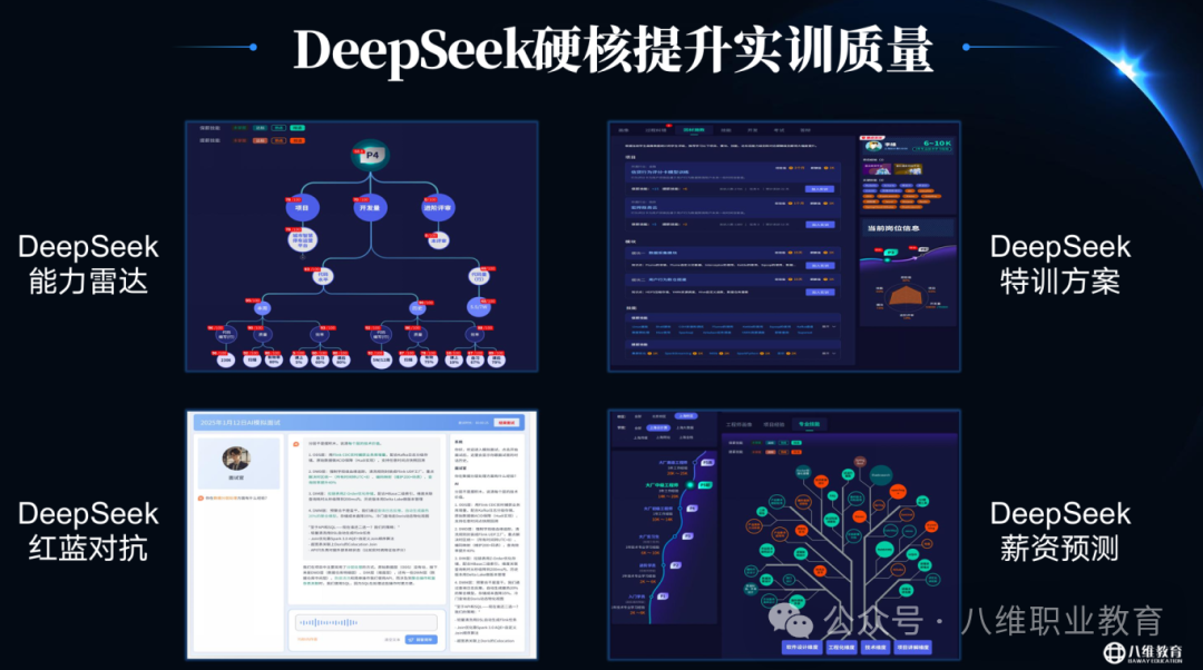 DeepSeek硬核提升實(shí)訓質(zhì)量主要體現在四個(gè)方面:能力雷達、特訓方案、紅藍對抗及薪資預測。