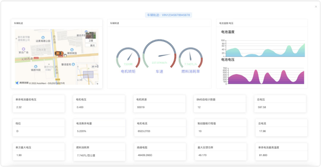 車(chē)輛實(shí)時(shí)數據功能對采集到車(chē)輛的數據進(jìn)行實(shí)時(shí)分流,秒級延遲實(shí)時(shí)展示車(chē)輛數據狀態(tài)。功能通過(guò)集成車(chē)輛信息、定位與圍欄數據、儀表盤(pán)、電池/發(fā)動(dòng)機溫度與電壓等關(guān)鍵參數,故障提示信息,VCU、MCU、BMS、EPS、EAS等核心指標,更直觀(guān)地分析和監控車(chē)輛運行狀態(tài)。解決難以實(shí)時(shí)掌握車(chē)輛運行狀態(tài),導致響應滯后、決策不及時(shí)。通過(guò)實(shí)時(shí)展示車(chē)輛數據,可實(shí)現對車(chē)輛狀態(tài)的全天候監控,提升管理效率與應急響應能力,增加車(chē)輛安全為無(wú)人駕駛提供重要的數據來(lái)源