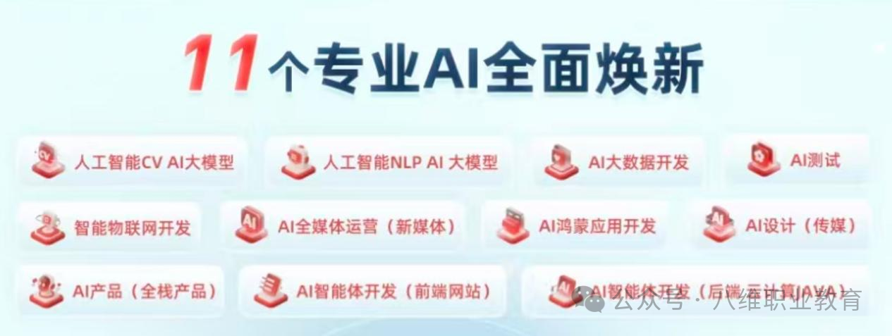 八維教育新課程體系,專(zhuān)業(yè)技能+AI工具+AI研發(fā),以AI+卓越工程師為目標崗位,幫助學(xué)生用AI改變世界。人工智能CV、人工智能NLP、大數據、移動(dòng)測試、物聯(lián)網(wǎng)開(kāi)發(fā)、新媒體、游戲開(kāi)發(fā)、傳媒、全棧產(chǎn)品、網(wǎng)站開(kāi)發(fā)、云計算開(kāi)發(fā)11個(gè)專(zhuān)業(yè)方向,全面向“AI”再升級!