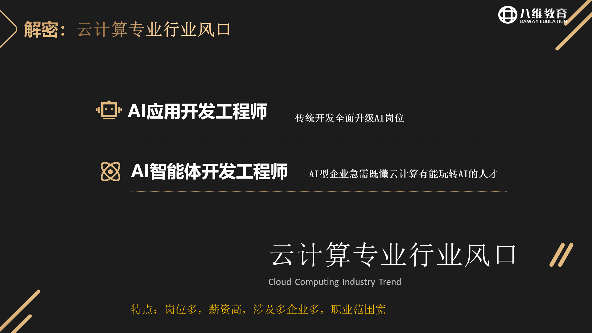 AI應用開(kāi)發(fā)、智能體研發(fā)(如智能醫生、工業(yè)機器人)均依賴(lài)云計算提供的彈性算力與存儲能力。未來(lái),隨著(zhù)傳統應用向AI化升級的需求持續爆發(fā),云計算人才將成為跨行業(yè)轉型的“剛需資源”。