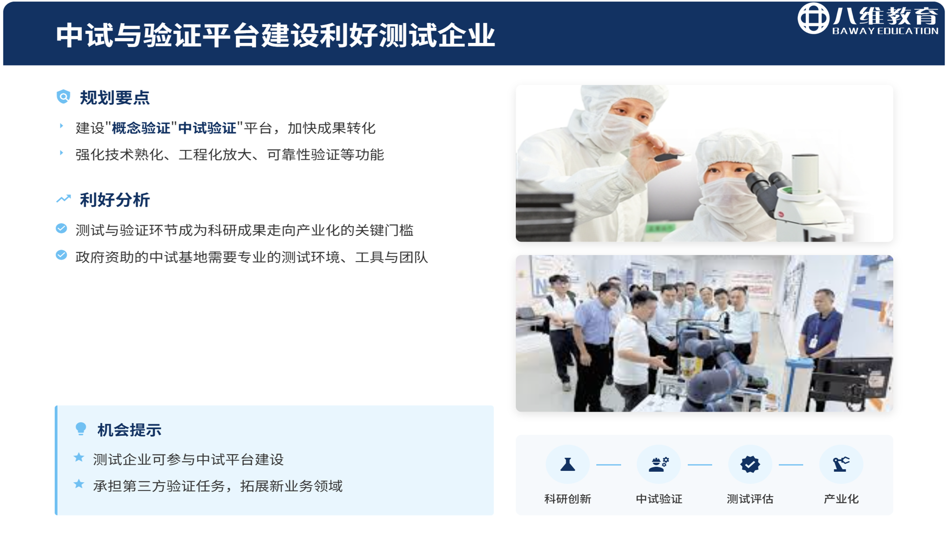 科研成果驗證與中試平臺:國家中試平臺打通科研轉化通路,工業(yè)軟件驗證中心、AI算法評測基地等基礎設施依賴(lài)測試能力。
