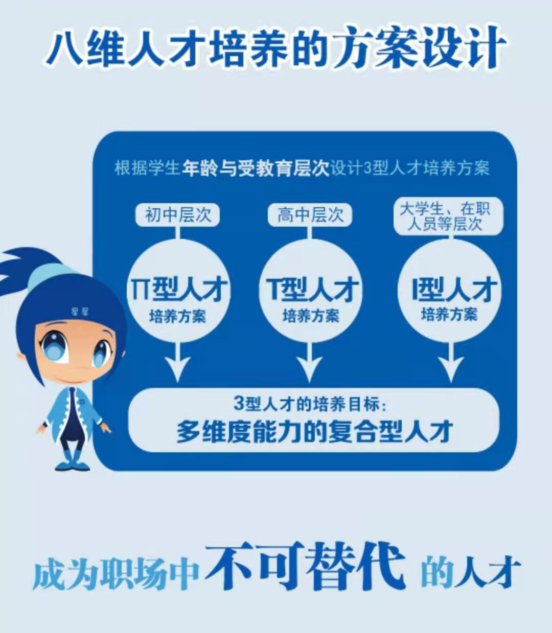 八維因材施教,針對不同階段學(xué)生的學(xué)習特點(diǎn),開(kāi)發(fā)出“三型人才”培養體系:“I型人才”為大學(xué)生量身打造;“T型人才”充分滿(mǎn)足高中生學(xué)習需求:“π型人才”的培養目標是使初中生成長(cháng)為“兩專(zhuān)多能的復合型人才”。三大產(chǎn)品各有特色與側重,能更好的彌補不同層次學(xué)生的不足,同時(shí)發(fā)揚他們的長(cháng)處,真正做到“補短揚長(cháng)”。