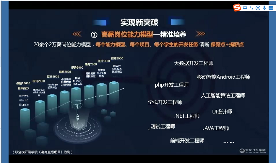 “靶向培養”,八維走訪(fǎng)調研各大企業(yè),把握到了IT技能崗位的能力要求,制作出了崗位能力模型。對標這些能力模型,就能夠將學(xué)生技能中的“保薪點(diǎn)”、“提薪點(diǎn)”清晰地標注出來(lái),從而設計出更有針對性的實(shí)訓項目,實(shí)現“靶向培養”。