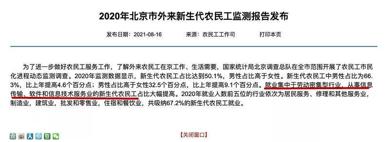 近日,人社部發(fā)布2020年北京市外來(lái)新生代農民工監測報告,報告中的一句話(huà),讓這份本不會(huì )太受關(guān)注的文件,成了熱議討論的熱點(diǎn):“就業(yè)于勞動(dòng)力密集型行業(yè),從事信息傳輸、軟件和信息服務(wù)業(yè)的新生代農民工占比大幅提高”。
