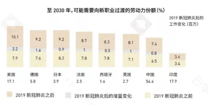 對中國而言,新興技術(shù)對中國勞動(dòng)力市場(chǎng)的影響將會(huì )更大。麥肯錫的數據指出,預計中國在疫情之后將有7.4%的工作崗位面臨被新職業(yè)替代。這就意味著(zhù)會(huì )有大量員工面臨失業(yè),或需要通過(guò)培訓獲得新的就業(yè)機會(huì )。