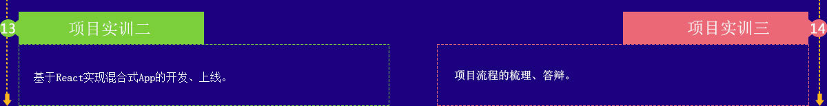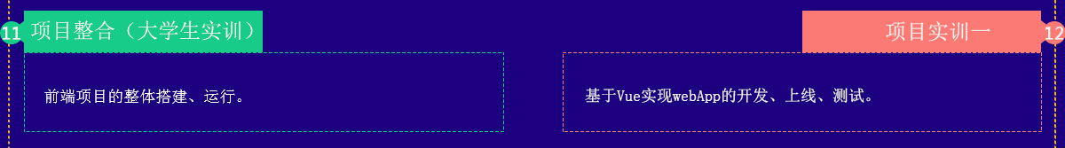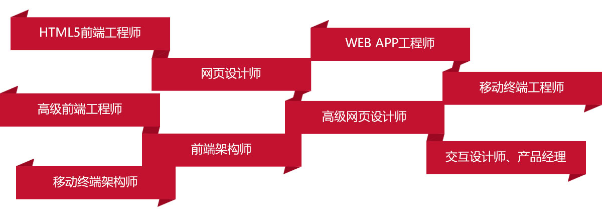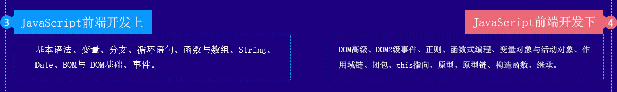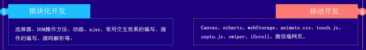HTML5、CSS3、Canvas、移動(dòng)端項目開(kāi)發(fā)、微信公眾平臺、小程序開(kāi)發(fā)、(AngularJS、VueJS、ReactJS、React Native)+綜合項目、設計規范(AMD、CMD)、前端模塊化(RequireJS+淘寶的SeaJS)