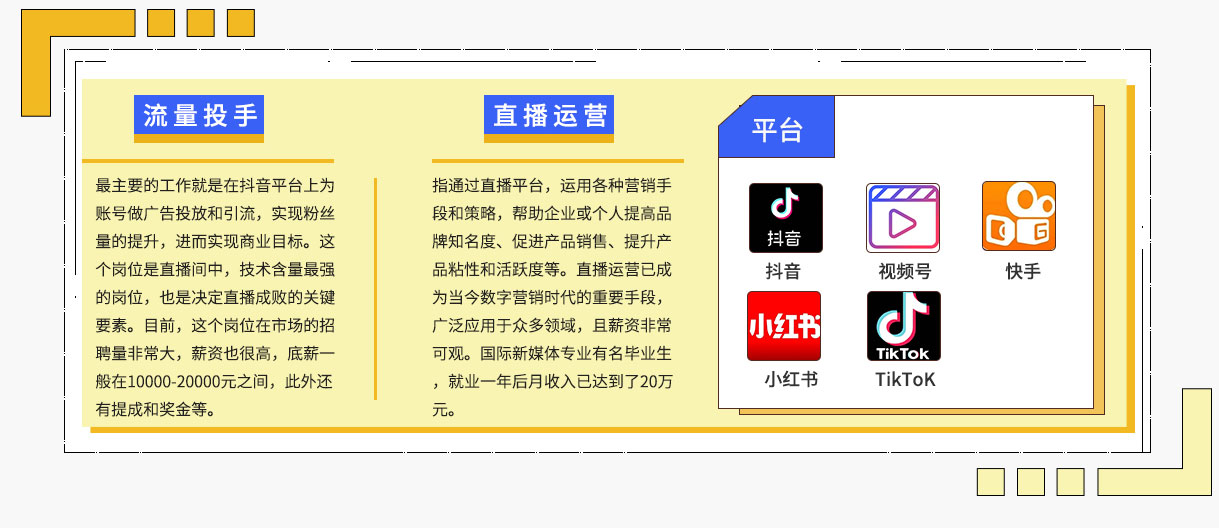 1.了解專(zhuān)業(yè)大方向,認識信息流,推廣渠道,關(guān)鍵數據指標,直播數據平臺認識。 2.信息流廣告圖落地頁(yè)設計。 3.直播間物料設計,直播間環(huán)境搭建