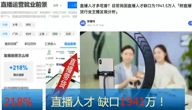 當前,直播經(jīng)濟已成為驅動(dòng)社會(huì )經(jīng)濟發(fā)展的重要力量。作為時(shí)下最炙手可熱的商業(yè)模式,它與傳統模式相比,展現出了革命性突破。在空間上,它能夠瞬間連接十萬(wàn)乃至數百萬(wàn)觀(guān)眾,實(shí)現跨地域、大規模的同時(shí)在線(xiàn)互動(dòng),時(shí)間上,可以提供24小時(shí)不間斷的內容流,滿(mǎn)足不同時(shí)區、不同生活習慣消費者的多元需求。這種模式,不僅讓買(mǎi)賣(mài)雙方跨越了傳統銷(xiāo)售模式的局限,更促進(jìn)了商品交易場(chǎng)景的全面升級,展現出強大的生命力和發(fā)展潛力。進(jìn)一步而言,直播經(jīng)濟正為年輕一代開(kāi)辟廣闊的就業(yè)與創(chuàng )業(yè)藍海。根據前瞻網(wǎng)的權威數據我國直播經(jīng)濟領(lǐng)域的人才需求缺口已高達1941萬(wàn),這一數字凸顯了該行業(yè)對新型人才的迫切需求。
