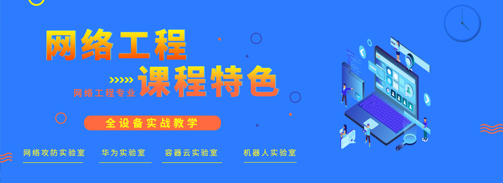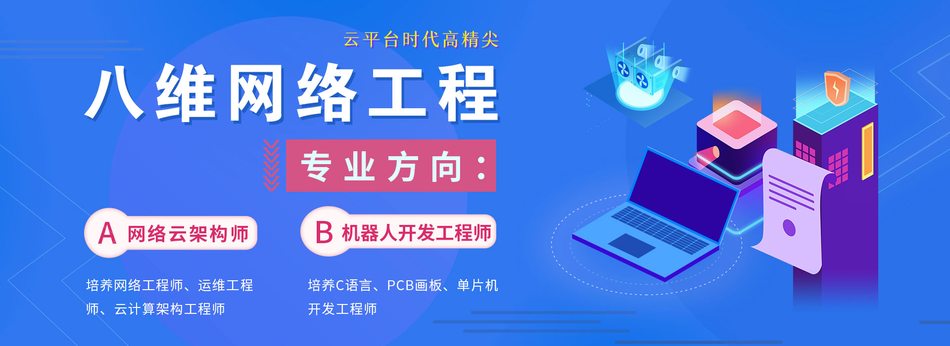 八維網(wǎng)絡(luò )工程專(zhuān)業(yè)是八維最早的一個(gè)專(zhuān)業(yè),累計已培養3萬(wàn)多名優(yōu)秀工程師,專(zhuān)業(yè)下設了網(wǎng)絡(luò )云架構師和工業(yè)機器人兩大教學(xué)方向。網(wǎng)絡(luò )工程專(zhuān)業(yè)擁有累計投資1000多萬(wàn)(其中350多萬(wàn)為北京市教委資金支持)成立的云計算實(shí)驗室、網(wǎng)絡(luò )攻防實(shí)驗室、容器云實(shí)驗室,還有大批企業(yè)贊助捐贈的機器人教學(xué)設備,有著(zhù)高端的硬件設施。