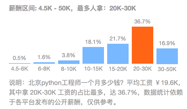 目前我國智能應用開(kāi)發(fā)已處于世界領(lǐng)先水平,行業(yè)缺口巨大,人才市場(chǎng)上符合企業(yè)需求的智能應用開(kāi)發(fā)工程師供不應求。Python是一款流行的計算機編程語(yǔ)言 ,具有簡(jiǎn)單、易學(xué)免費、開(kāi)源、可移植、可擴展、可嵌入以及面向對象等特點(diǎn),擁有強大的庫,簡(jiǎn)潔 的幾行代碼即可實(shí)現強大的功能,應用范圍廣,可廣泛應用于web開(kāi)發(fā)、網(wǎng)絡(luò )編程、數據分析、人工智能應用、金融分析等。Python開(kāi)發(fā)工程師的全國日招聘需求量達到10W+,北京、上海等一線(xiàn)城市日招聘量超過(guò)1W+。Python開(kāi)發(fā)工程師的平均工資也很高,根據職友集2020年3 月北京地區的數據統計,1.5萬(wàn)以上占比達到69.7%