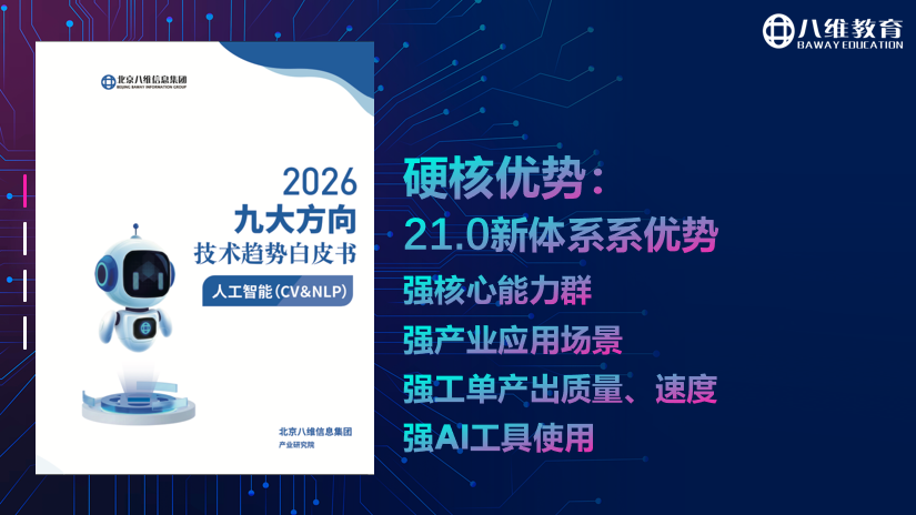AI 浪潮不可逆轉,技術(shù)紅利轉瞬即逝。選擇八維教育人工智能專(zhuān)業(yè),就是選擇站在科技前沿,手握職業(yè)王牌。在這里,知識轉化為能力,實(shí)訓沉淀為履歷,夢(mèng)想升級為現實(shí)。...